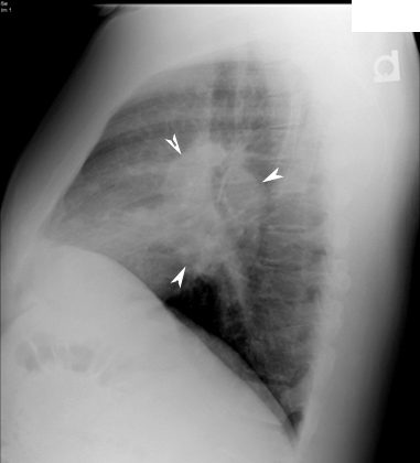 Arrowheads point to hilar adenopathy.