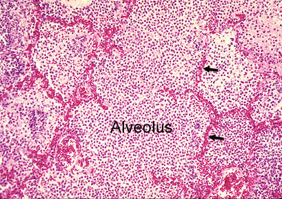 - Alveoli are filled with fibrin and inflammatory cells, predominantly neutrophils.