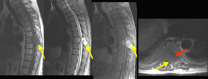 | Pre-contrast sagittal T 1 wtd. MRI of the thoracic spine | Sagittal T 2 wtd. MRI | Post contrast sagittal T 1 wtd. MRI | Pre contrast axial T 1 wtd. MRI |