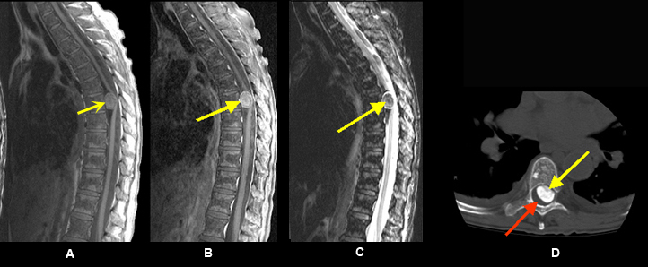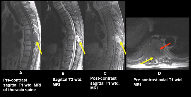 - yellow arrow points to an intradural ventrally located tumor producing thoracic cord compression.