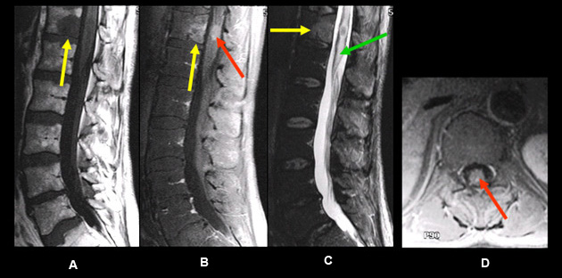 Bony metastasis involving the T8 vertebral body, right pedicle/transverse process and spinous process (yellow arrows in A,B,C,D) with epidural tumor producing marked degree of cord compression (red arrow).