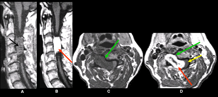 - sausage-shaped intensely enhancing tumor (yellow arrow) is seen within the upper cervical cord extending from just above the craniocervical junction with involvement of the dorsal medulla (black arrow) down to C5 level